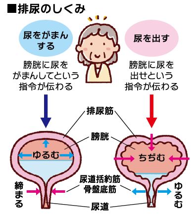 膀胱に尿がある程度たまると膀胱から脳に信号が送られて尿意が起こります。しかし、脳が「まだがまんして」という指令を膀胱へ送ると膀胱がゆるみ、膀胱や尿道を支える骨盤底筋や尿道括約筋が連携して尿道を締め、尿を漏らさないようにするのです。トイレに行き準備が整うと、今度は脳から「出してもいいよ」という信号が送られ、膀胱が収縮して尿道の筋肉がゆるみ、尿を出します(下図)。