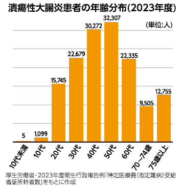 炎症性腸疾患は欧米に多く、日本では患者数が少ない病気でした。しかし近年、日本でも患者数が増加し、2024年度に潰瘍性大腸炎で難病医療費助成制度を利用した人は、指定難病の中で最も多くなっています。