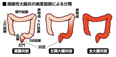 潰瘍性大腸炎が疑われるときには、大腸内視鏡検査、血液や便の検査を実施します。大腸内視鏡検査は、先端に電子カメラがついた内視鏡と呼ばれる器具を肛門から挿入し、腸の粘膜の状態を調べる検査です。炎症や潰瘍による病変があった場合、その病変が直腸に限られる直腸炎型、直腸から脾ひわんきょく彎曲までにとどまる左側大腸炎型、直腸から脾彎曲を超えて広がっている全大腸炎型の3つに分類されます(下図)。また、排便回数、血便、発熱、脈拍、貧血(ヘモグロビン値)、赤沈(赤血球沈降速度)、CRP(C反応性タンパク)などの数値によって、軽症、中等症、重症に分けられます。軽症か中等症の場合は通院治療が中心ですが、重症になると入院が必要です。