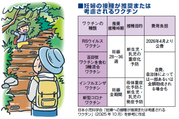 2026年4月からは、乳児がかかると肺炎になることもあるRSウイルス感染症の予防ワクチンを妊婦が公費(無料または一部自己負担)で定期接種できるようになります。このワクチンは、妊婦が接種すると胎児に抗体が移行する母子免疫ワクチンです。