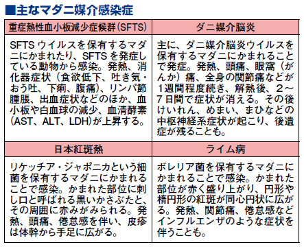 マダニに注意が必要なのは、病原体をもっているマダニにかまれたあと、重症熱性血小板減少症候群(SFTS)、ダニ媒介脳炎、日本紅斑熱、ライム病などのマダニ媒介感染症を発症することがあるからです(下表)。
