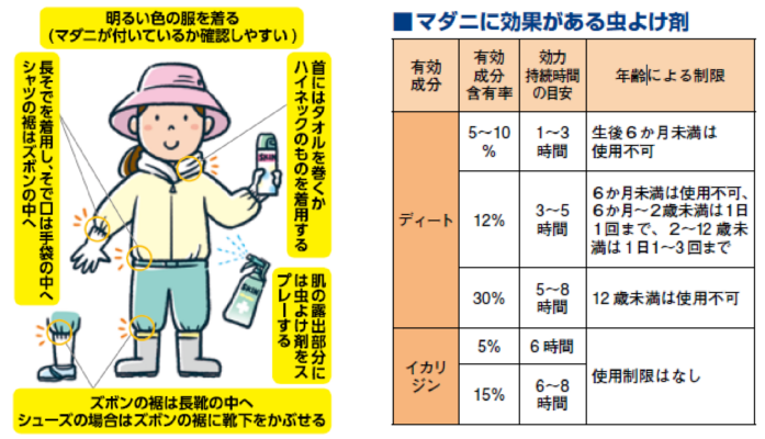 肌の露出部分には、マダニに効果があるディートやイカリジンが入った虫よけ剤を使いましょう(下表)。