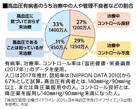推計4,300万人の高血圧患者のうち、生活習慣の改善や薬物療法によって血圧がコントロールできている人は1,200万人(27%)にすぎず、3,100万人(73%)は血圧が高い状態を放置しています。自分が高血圧だと認識していない人は1,400万人、認識してはいるけれども未治療の人が450万人、治療中だがコントロール不良の人が1,250万人もいるとみられます(下図)。