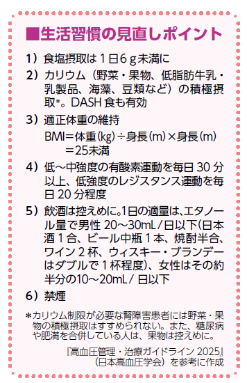 生活習慣の見直しポイントの中で、最優先の課題は減塩です※1 。1日の食塩摂取量は6g 未満に抑えましょう。「国民健康・栄養調査(2024年)」によると、日本人の1日の食塩摂取量の平均は女性8.7g 、男性10.1g で、以前よりは減少しているものの、まだ塩分をとり過ぎています。塩分摂取量は、尿中のナトリウム/カリウム比から推計できます。気になる場合はそのような検査をおすすめします。