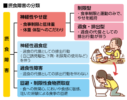 「ものすごくやせて見えるのに、本人は太っていると思い込む」「100gでも体重が増えると生きている価値がないと感じてしまう」。神経性やせ症とは、ボディイメージへのこのような歪んだ認識などから、「体重を意図的に減少させようとする行動」と低体重が特徴の摂食障害の一種です。神経性やせ症には、やせるために食事を制限する制限型と、食事制限の反動による過食とその代償行動(嘔吐、下剤・利尿剤・やせ薬の乱用)が特徴の過食・排出型があります(下図)。これら2つのタイプを行き来する人もいます。
