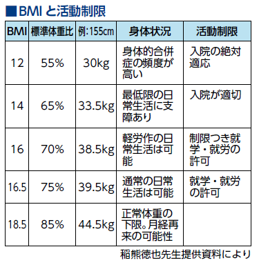 医療機関では、標準的な体重と比べてどの程度低いか(BMI)を評価し、体重や体型についてどのように考えているかを聞き取ります。