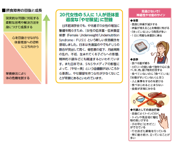 また、低体重の状態が続くと骨粗しょう症や無月経の原因となり、将来の骨折や不妊にもつながります。脳の萎縮もみられ、記憶力・思考力・ストレス耐性が低下して、うつ状態になったり、気分が不安定になったりします。