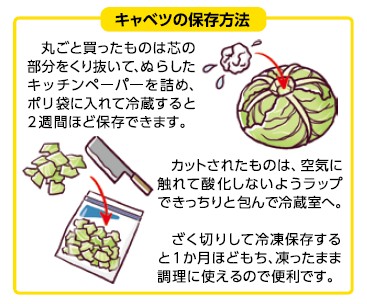 ら糖度を増しているからです。冬キャベツは春キャベツとは逆に、葉がしっかり巻かれていて、ずっしりと重いものを選びましょう。半分や1/4にカットされたキャベツは、切り口が黄色で、みずみずしいものを選んでください。