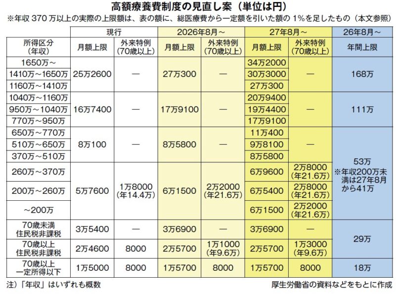 見直し案では、2026年8月から、月ごとの上限額がすべての所得区分で引き上げられます(下表)。平均所得層では、自己負担額算定のベースとなる定額部分が現行の8万100円から5,700円増の8万5,800円になります。